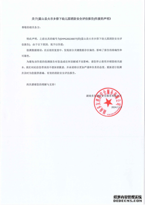 关于【蓝山县火市乡排下幼儿园消防安全评估报告】作废的声明
